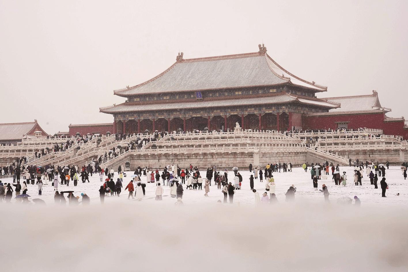 ①12月12日,游客在北京故宫冒雪游览。