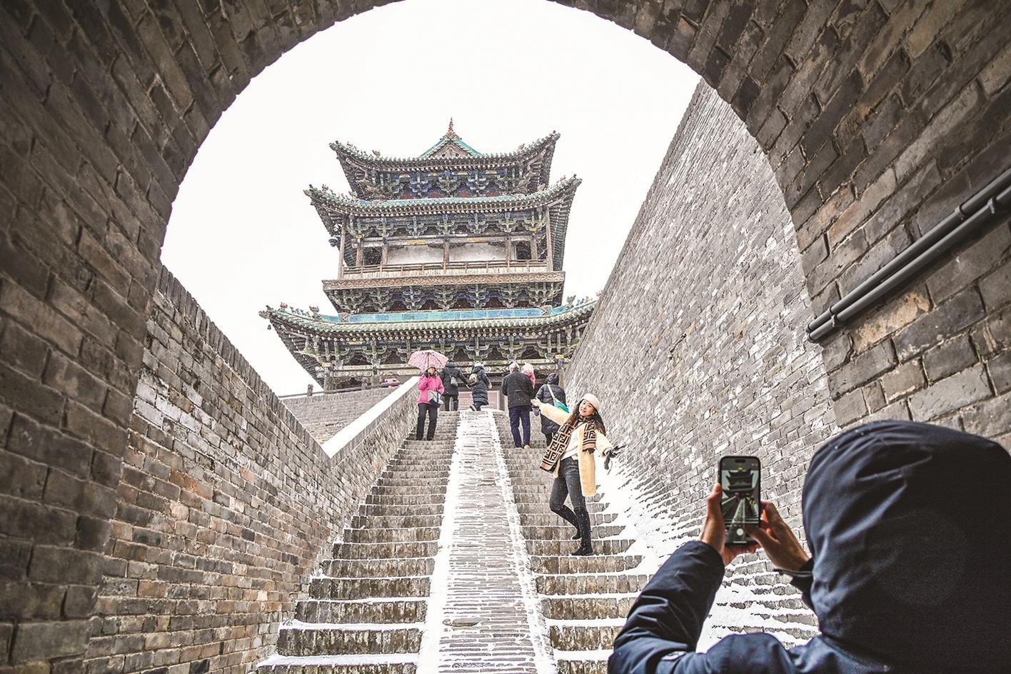 ②12月12日股策略,游客冒雪在位于山西省晋中市的平遥古城游览观光。