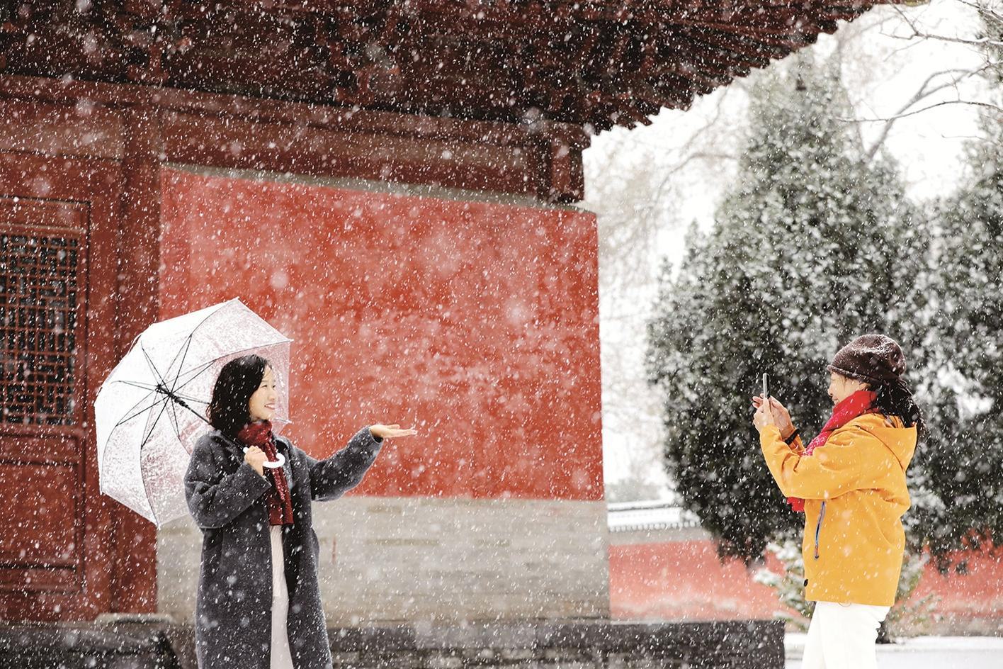 ③12月12日,市民在河南省济源市济渎庙赏雪拍照。