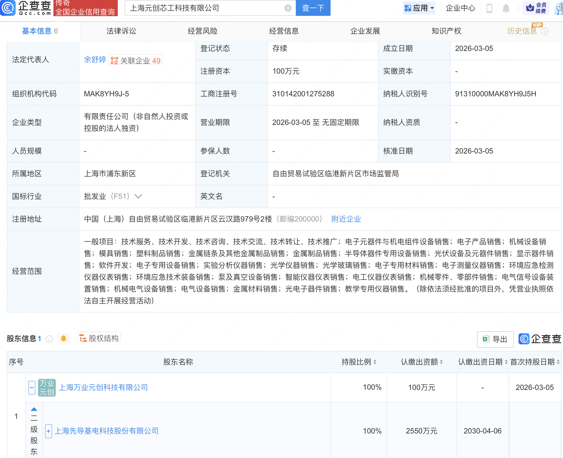 近日,上海元创芯工科技有限公司成立,经营范围包含:半导体器件专用设备销售;光伏设备及元器件销售;显示器件销售;软件开发等。企查查股权穿透显示,该公司由先导基电(600641)间接全资持股。